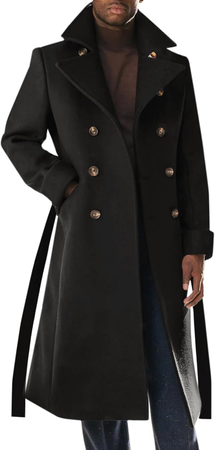 - ►【Feature】: Mens winter casual overcoat features a classic design, including two side pockets and inner pocket, long sleeve, double breasted and classic notch lapel add a sophisticated touch to your outfit, The belt design makes this coat more fashionable, thick quilted lining makes the coat warmer.