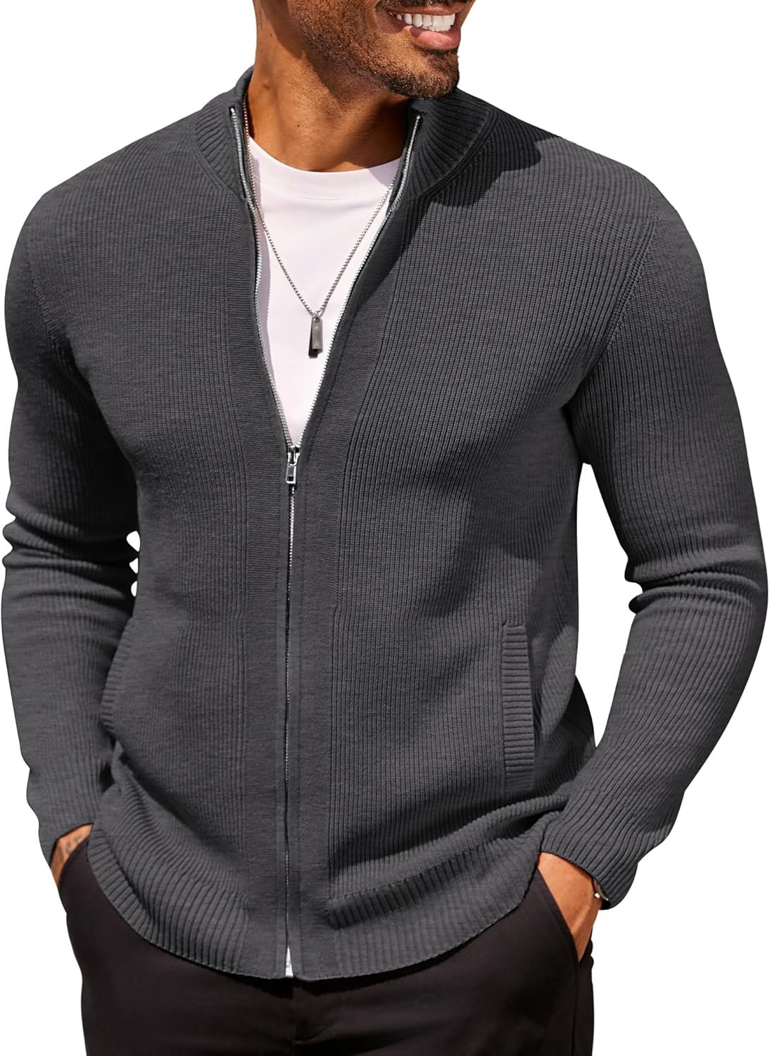 Mens Zip Up Cardigan Sweater Slim Fit Casual Full Zip Sweaters Knit Stand Collar Cardigans with 2 Front Pockets